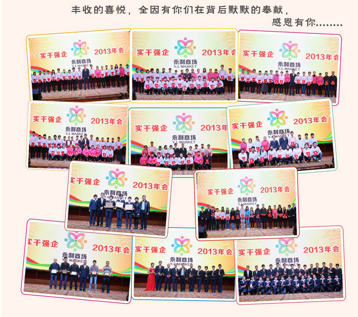 2014年1月9日全体永利人欢聚在江门金凯悦大酒店举行2013年度员工大会。在年度大会上,总经理王亚成围绕年会主题发表了只有实干方能强企的重要讲话,紧接着副总经理谢杰周总结了2013年公司的成功扩展和各门店的创造的优异成绩,同时还明确了2014年实干强企的发展方向。