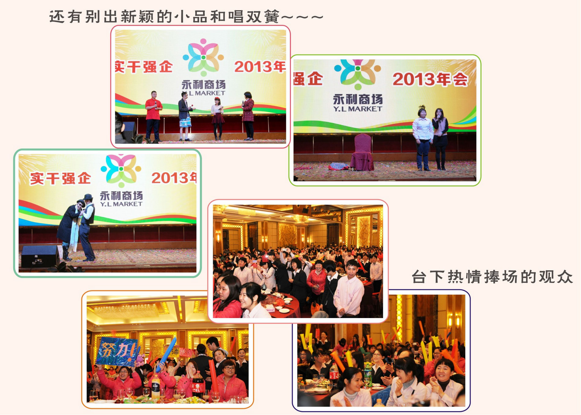 在年会上,全体永利人在欣赏着各门店部门倾情演出的节目同时,欢声笑语地享受着公司精心准备的团年饭,而万众期待的幸运大抽奖更是为年会掀起一波又一波的热浪。下面就让我们共同欣赏全体永利人的辛勤丰硕成果和丰富多彩的年会节目。